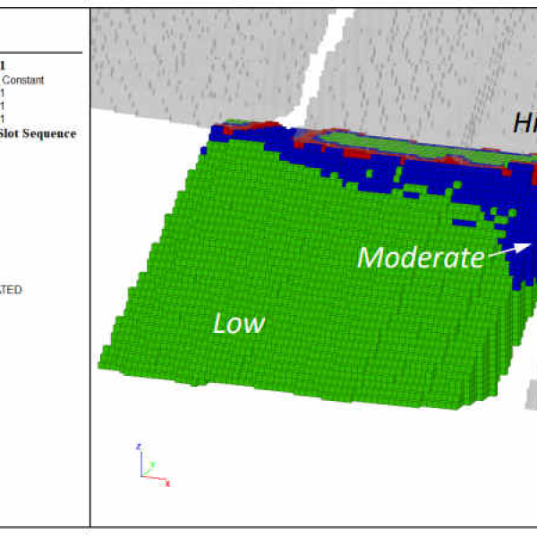 - We are continuously refining the criteria associated with the various risk profiles we have pioneered, whereby the geomechanical difficulties anticipated by our models are quantified per time unit (typically monthly, quarterly or bi-yearly) in terms of tonnes of ore or oz /lb of metal in the ‘High,’ ‘Moderate’ and ‘Low’ risk categories. These graphs (example below) allow to readily identify steps in the modelled sequence where production could be compromised by geotechnical issues.